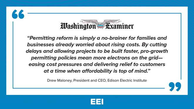 WASHINGTON (November 19, 2025) — The Washington Examiner earlier today published an op-ed by Edison Electric Institute (EEI) President and CEO Drew Maloney urging Congress to enact comprehensive permitting reform. In the piece, Maloney explains why streamlining antiquated permitting processes is essential to meeting unprecedented electricity demand, strengthening the energy grid, supporting job creation, and ensuring reliable, affordable electricity for customers nationwide.