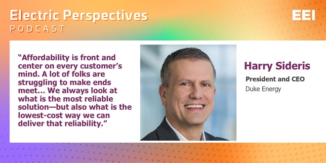 Electric Perspectives podcast featuring Duke Energy President and CEO Harry Sideris. In the conversation, Harry discusses his vision for Duke Energy’s future, the company’s response to the devastating 2024 hurricane season, and how he and his team are working to deliver affordable, reliable electricity to millions of customers as demand continues to grow.